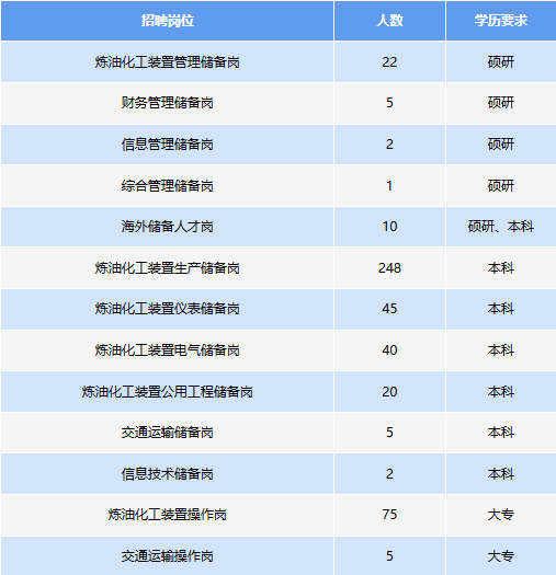 炼油化工装置管理岗、储备岗、操作岗等13个岗位,总计招聘480人。