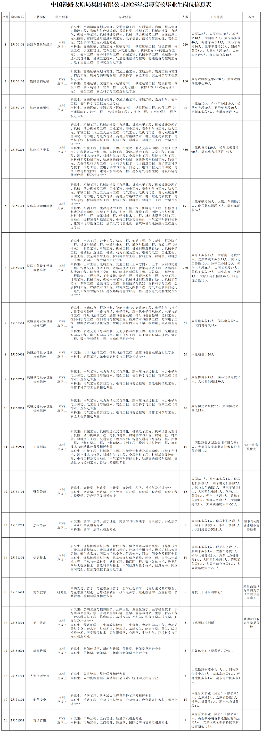 (三)须符合招聘岗位要求的学历、专业等条件,具有良好的身体条件和心理素质,适应长期在铁路沿线、偏远山区、艰苦环境地区工作及户外、野外、轮班、夜班作业要求,服从我公司对岗位的安排和调整。应聘运输生产一线岗位的须辨色力正常、双眼矫正视力不低于5.0。