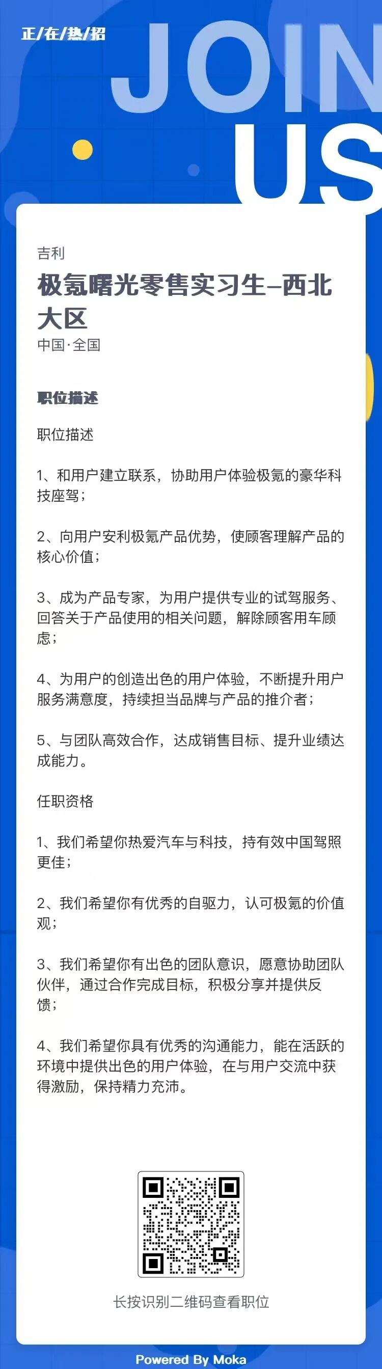 招聘要求:希望你热爱汽车行业、励志在新能源汽车行业长期发展、性格开朗活泼、学习能力强,有驾驶证更佳。