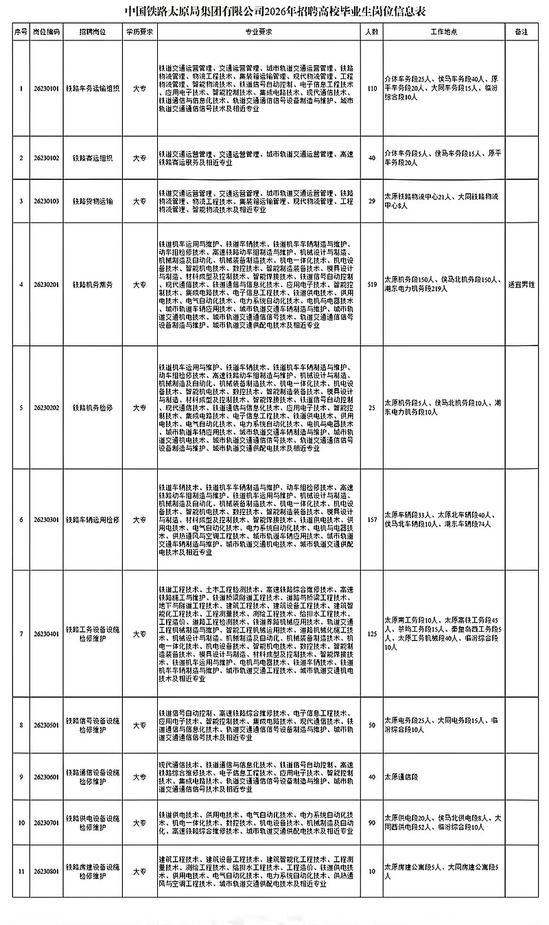 中国铁路太原局集团有限公司根据企业发展需要,现将2026年全日制普通高等职业院校高职(大专) 毕业生招聘有关事项公告如下: