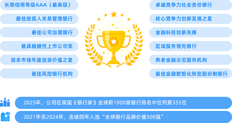 在公司治理、综合竞争力、金融创新、数字化转型、资产管理、养老金融和社会责任等各方面获得主流财经媒体颁布的各项荣誉,综合竞争能力持续提升。