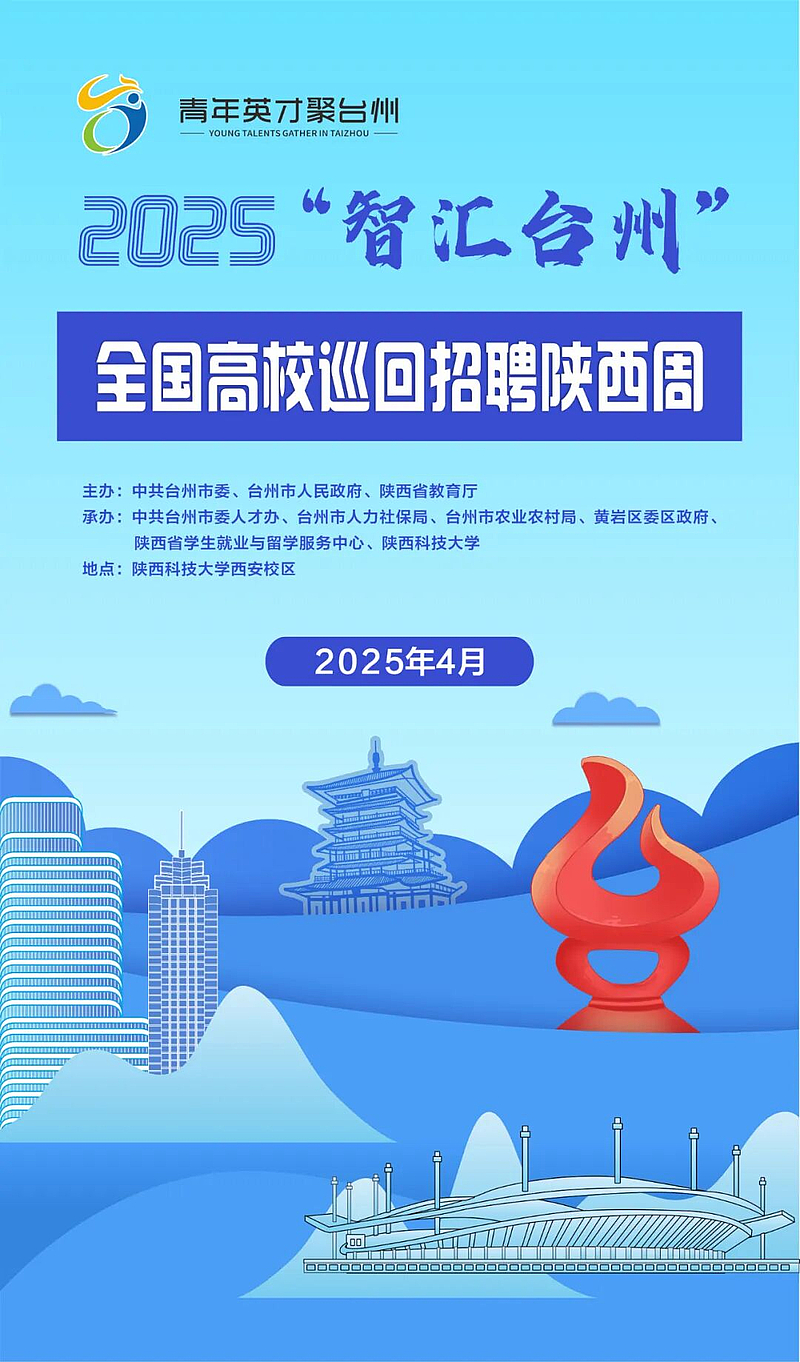为促进高校毕业生就业,进一步搭建用人单位与高校毕业生之间的对接桥梁,由中共台州市委、台州市人民政府、陕西省教育厅主办,中共台州市委人才办、台州市人力社保局、台州市农业农村局、黄岩区委区政府、陕西省学生就业与留学服务中心、陕西科技大学承办的2025“智汇台州”全国高校巡回招聘陕西周活动将于4月21日(周一)9:30-12:00在陕西科技大学西安校区举办。